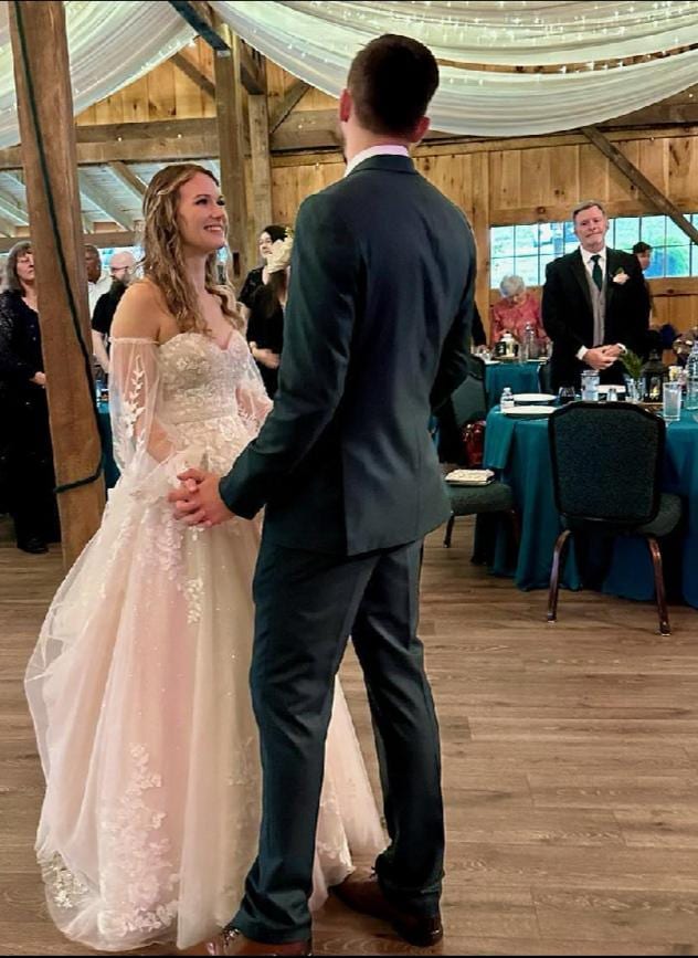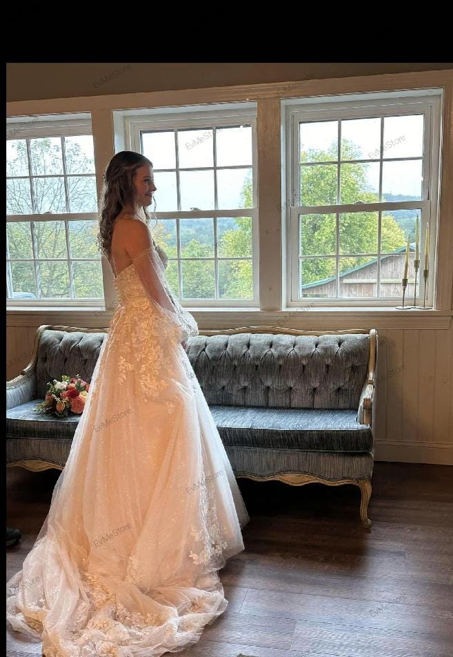 Detachable tulle sleeves with cuffs. The bottom of the sleeves is decorated with lace appliqués.