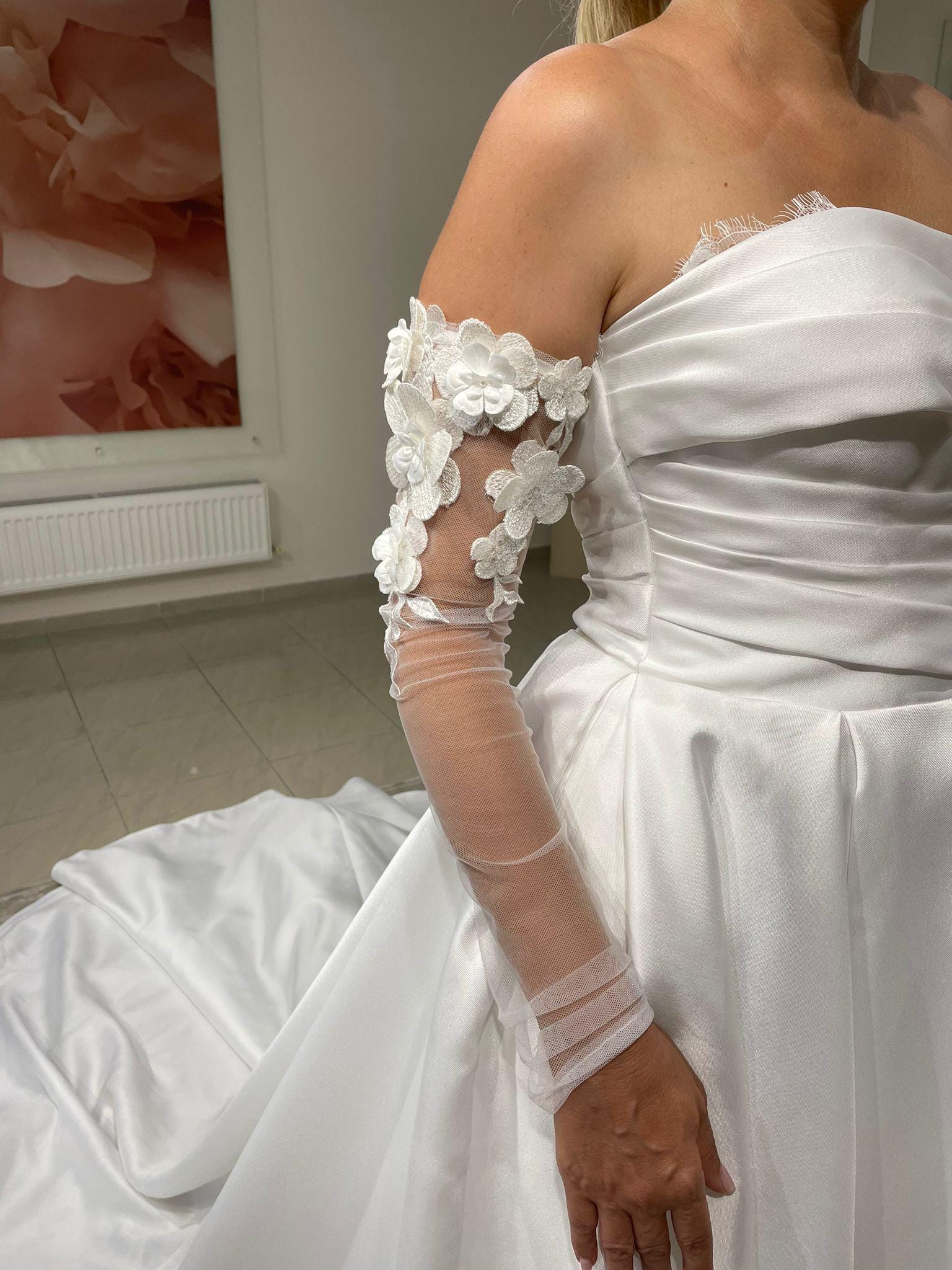 Handmade unique attachable bridal bicep tulle sleeves by yours truly, make from soft mesh and decorate with 3D flowers around of the bicep to your own measurements.