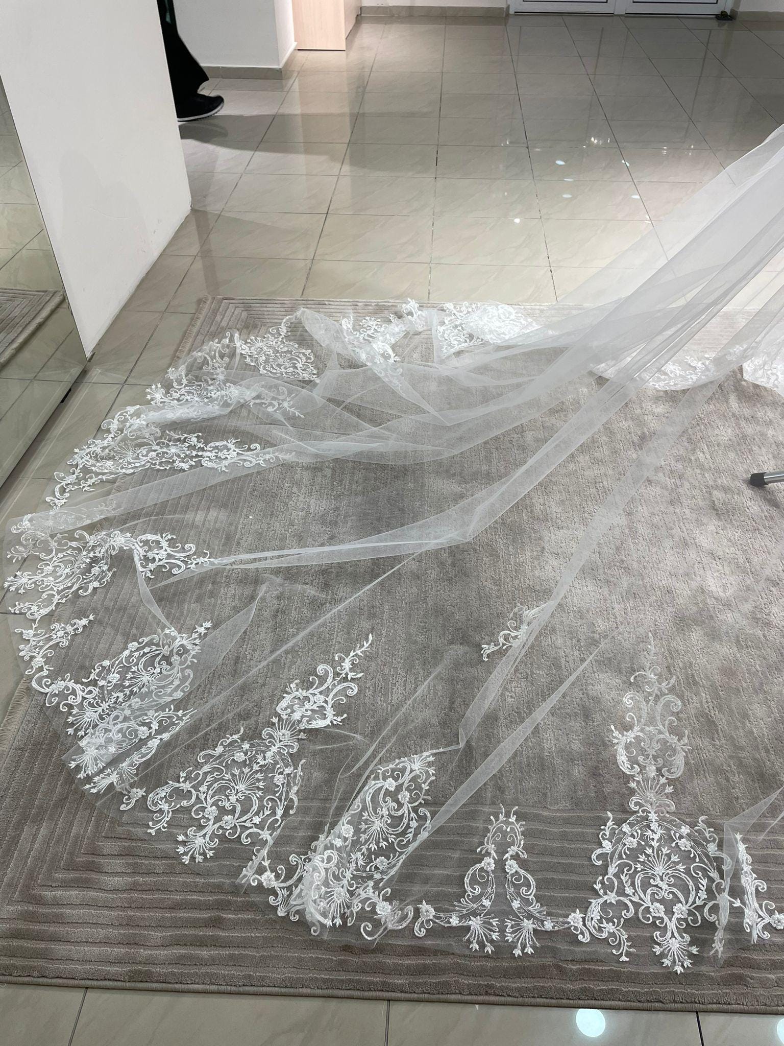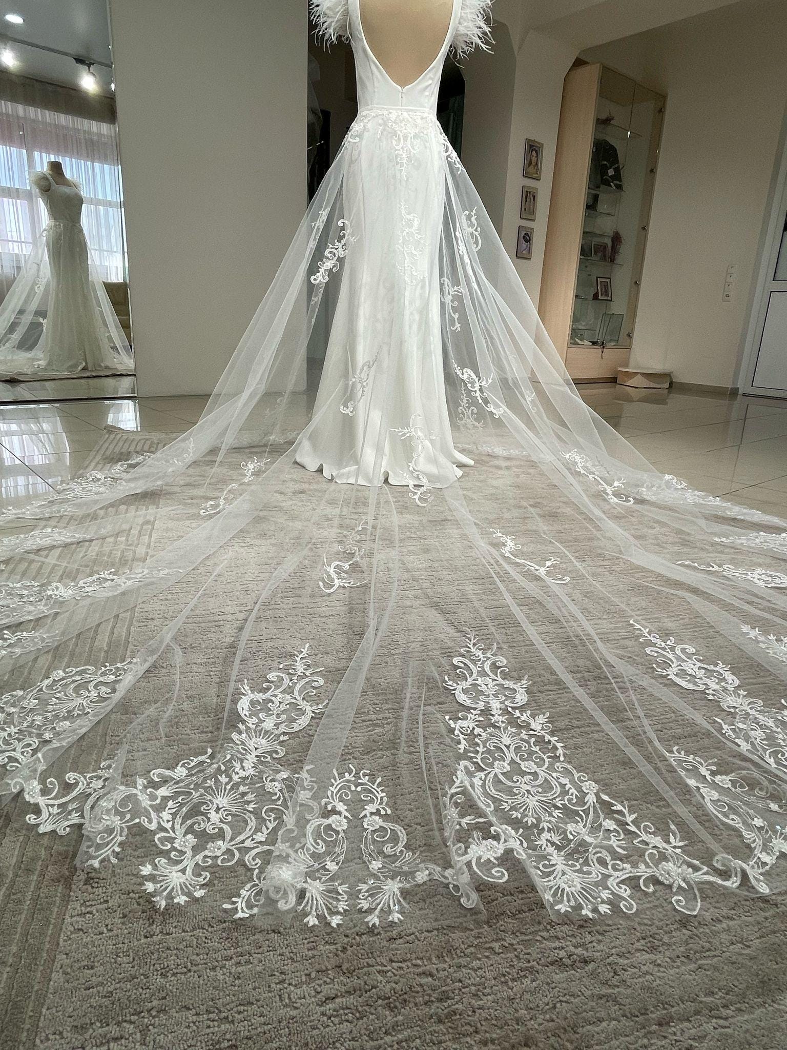 One layer of tulle is decorated bottom with lace . The train is made of soft tulle, which is attached to a tulle embroidery belt.